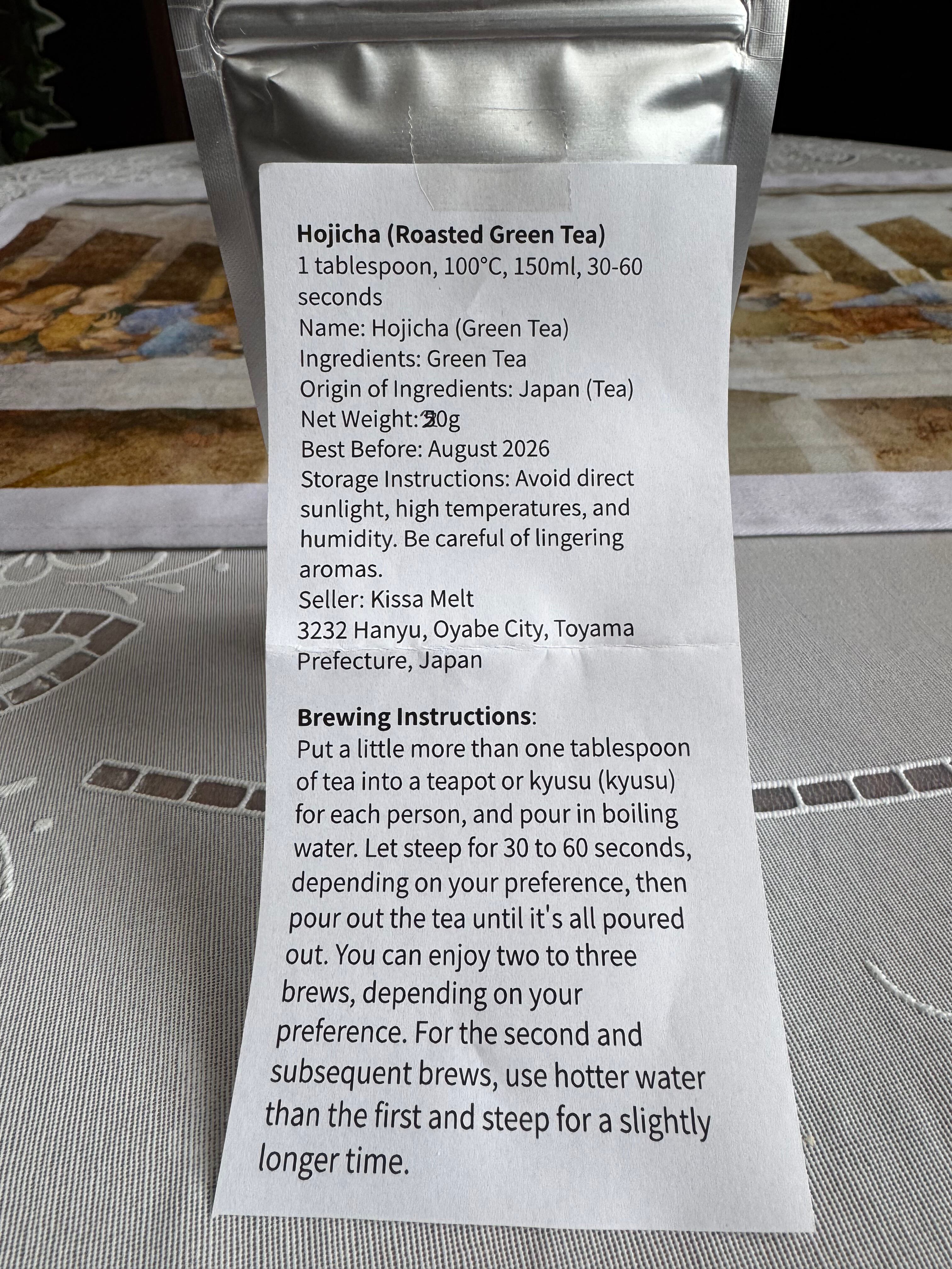 Steeping Instructions: Pour 150ml of freshly boiled water over 1 tablespoon (4g) of tea leaves. Let steep for 30-60 seconds, then pour the tea into a cup.